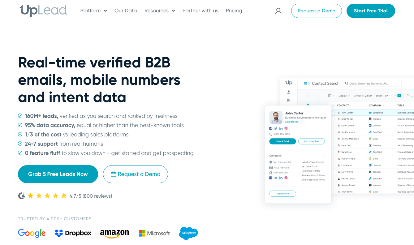 UpLead distinguishes itself through its pioneering role in email verification technology—their CTO literally invented email verification-as-a-service. The platform combines this foundational technology with AI validation and human QA to ensure data remains fresh, accurate, and immediately usable, backed by an impressive 95% accuracy guarantee.